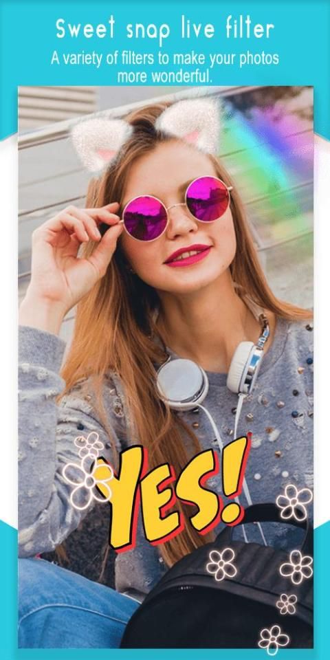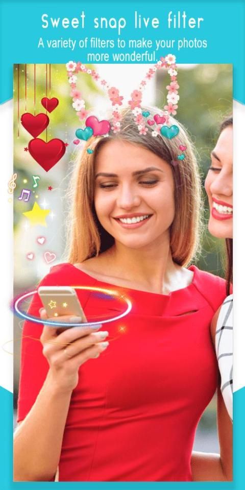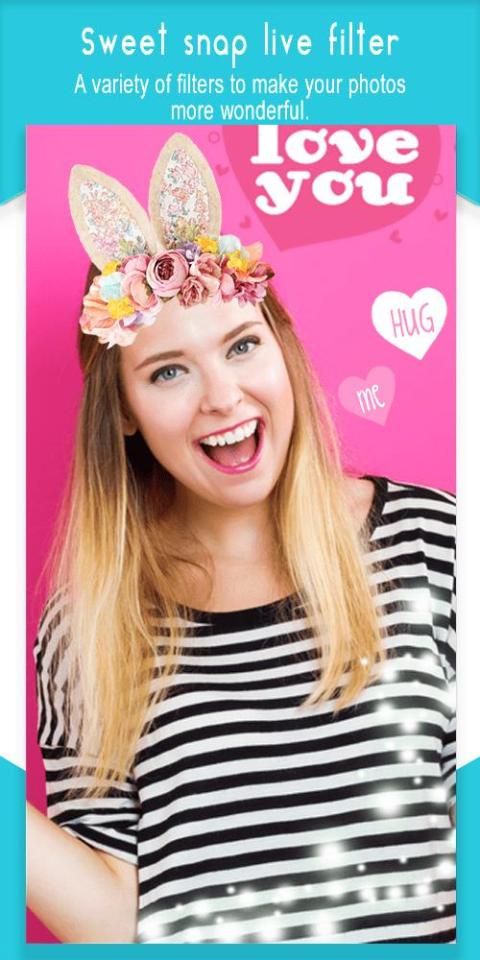 Sweet Snap – Live Filter will enable you to garnish your pictures with a fantastic collection of catchy stickers such as : lovely heart stickers , Colorful flower crown stickers, this app includes a wide range of adorable stickers like cute cat face camera ,cool dog camera , funny rabbit & bunnies stickers , panda face stickers that surely allows you to make your selfie pictures look stunning!, otherwise this interesting photo editor includes a lot of cool motion stickers.