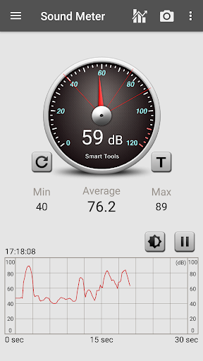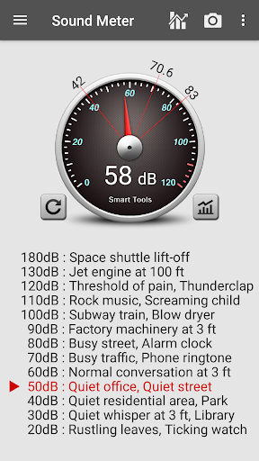 ध्वनि स्तर मीटर डेसिबल (डीबी) में शोर मात्रा को मापने के लिए आपके माइक्रोफ़ोन का उपयोग करता है, और एक संदर्भ दिखाता है।