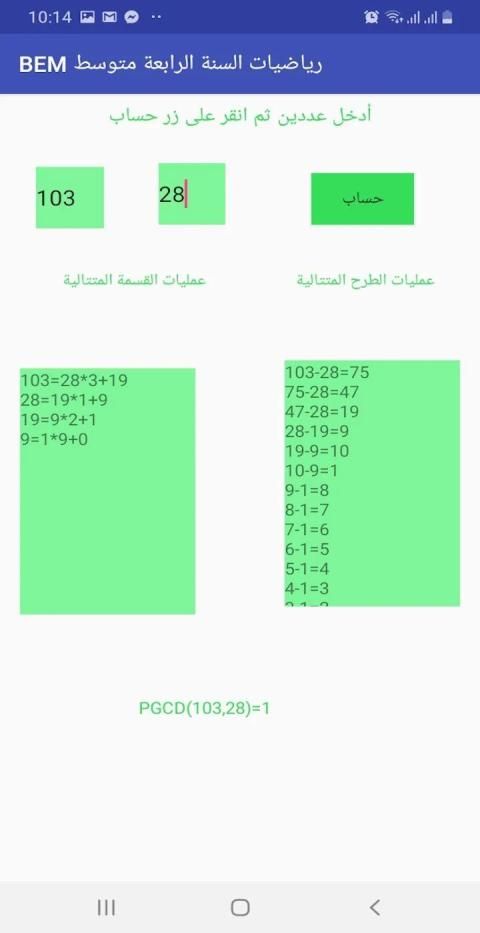 التطبيق يقوم أيضا بحسابات لخوارزمية إقليدس حيث عليك أن تدخل رقمين والتطبيق يظهر لك النتيجة النهائية مع كل المراحل و بطريقتي الطرح المتتالي و القسمة المتتالية
