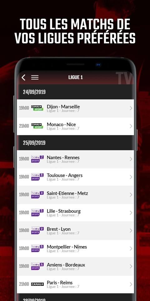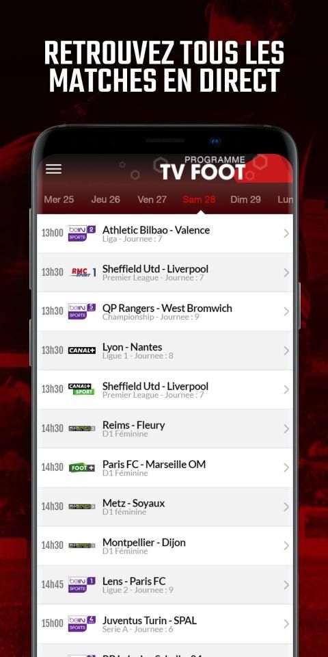 Elle vous permet de retrouver tout le programme TV foot sur sept jours, le programme télé foot de votre ligue,de votre équipe favorite ou encore d'une chaîne en particulier ! Que ce soit les matches, les émissions, les magazines, en différé ou en direct... tout est sur l'application, et ce quelle que soit les chaînes.