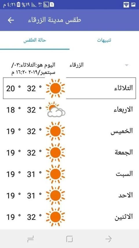 احصل على حالة الطقس المتوقعة للسبعة الايام القادمة من خلال تطبيق طقس مدينة الزرقاء، للعديد من مناطق مدينة الزرقاء.