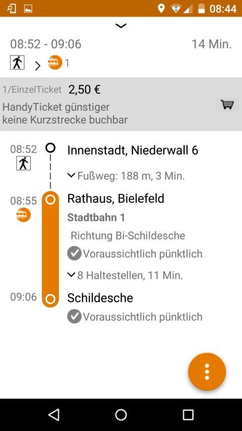 समय सारिणी की जानकारी: एक गंतव्य के लिए अपने स्थान से बस और ट्रेन से तेज मार्ग या एक शुरुआत पता लगाएं - दरवाजे से दरवाजा करने के लिए। पसंदीदा के रूप में बसों और ट्रेनों के लिए पसंदीदा यौगिकों सहेजें सार्वजनिक परिवहन Bielefeld के लिए टैरिफ जानकारी फोन या एक ही उपयुक्त टिकट खरीदते हैं। एसएमएस, ईमेल, WhatsApp या कैलेंडर के माध्यम से साझा करें। आपका कनेक्शन