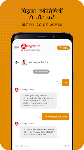 आप ज्योतिषी से ऑनलाइन बात कर सकते हैं। इस ऐप में 'ज्योतिषी से बात वाला फीचर इस ऐप को भारत का best Astrology app बनाता है। यह आपके लिए ऑनलाइन परामर्श लेना आसान बनाता है। आप किसी भी विशेषज्ञ ज्योतिष से घर बैठे तुरंत समाधान प्राप्त कर सकते हैं। वे आपकी कुंडली के आधार पर सटीक भविष्यवाणियां करते हैं। यदि आप घर बैठे top Astrologer से बात करना चाहते हैं, तुरंत MyPandit ज्योतिष ऐप इंस्टॉल करें और ऑनलाइन Astrology Consultation पाए।