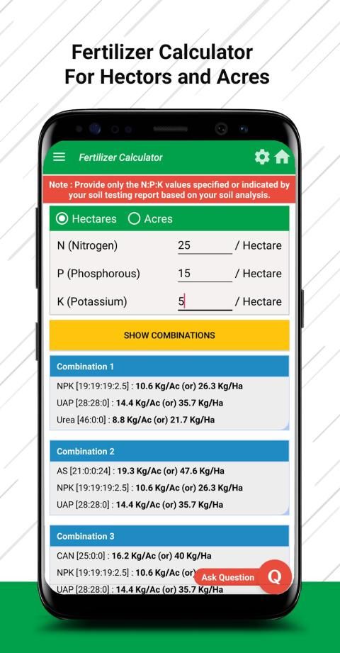 4. ప్రతి పంట కి కావలసిన ఎరువుల మిశ్రమాల (NPK Fertilizer Calculator) కాంబినేషన్స్ (50 కి పైగా).