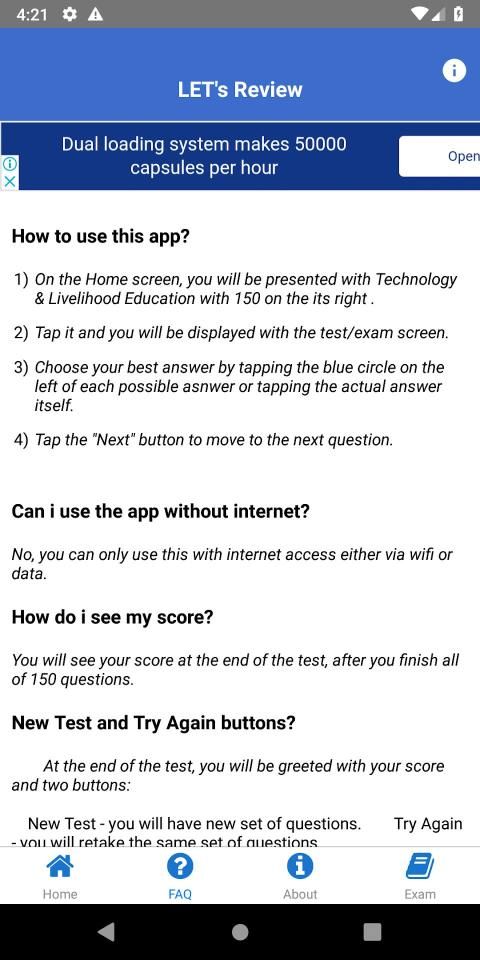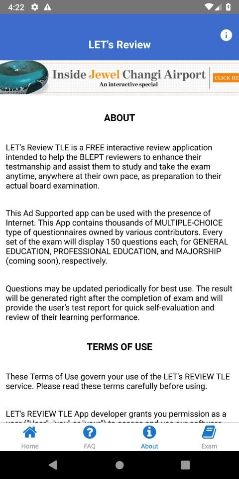 LETs Review TLE is a FREE interactive review application intended to help the BLEPT reviewers to enhance their testmanship and assist them to study and take the exam anytime, anywhere at their own pace, as preparation to their actual board examination.