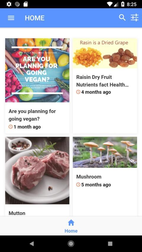 इस एप्लिकेशन में सब्जियां, फल, ड्राई फ्रूट्स, नॉन-वेज, डेयरी उत्पाद और जूस और पेय पदार्थ जानकारी अनुभाग शामिल हैं।