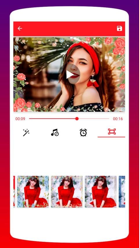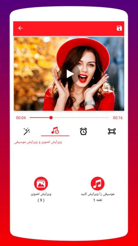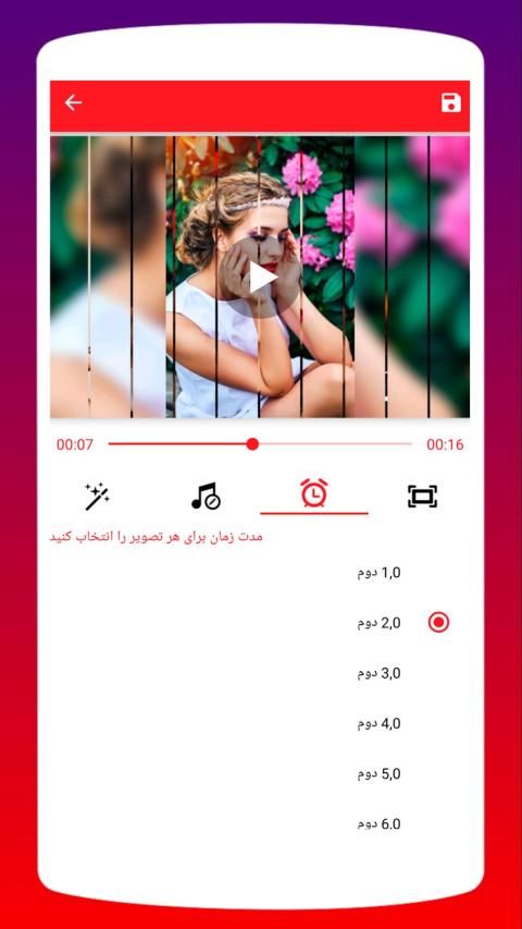 نمایش تصاویر به صورت خودکار و سفارشی کردن زمان فیلمبرداری: سازنده ویدیو موسیقی فریم های بسیاری را با موضوعات مختلف برای ایجاد فیلم های منحصر به فرد ارائه می دهد. مدت زمان نمایش اسلایدهای ویدیویی را با تنظیم زمان انتقال عکس به دلخواه خود تنظیم کنید