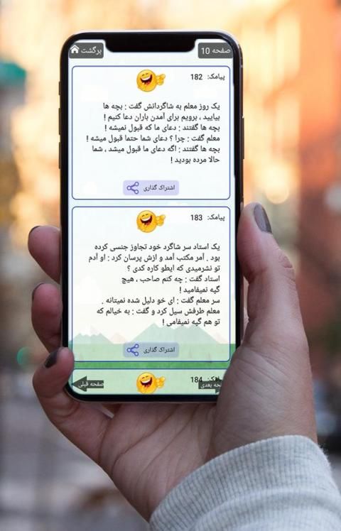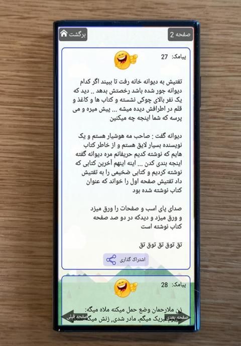 این برنامه شامل ایامه های خنده دار و فاراهی های جالب میباشد। آنها را خوانده و با دوستان تان شریی سازید। شما میتوانید از یریق برنامه پیام ر ها را در برنامه های اجتماعی: فسسبوک, انستاگرام, تلگرام .... به اشترام