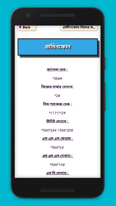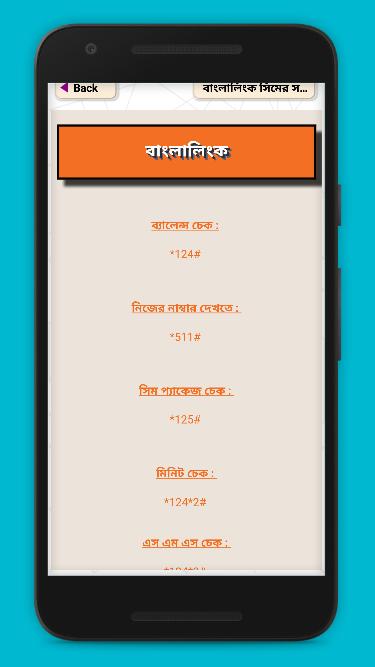 ভুলে যাওয়া মোবাইলে ফোনের নাম্বার কিভাবে চেক করতে হয়। সকল সিমের দরকারি কোড ও বোনাস, সকল সিমের অফার ও বোনাস টিপস, সব সিম এর ইন্টারনেট মেগাবাইট দেখার নিয়ম, ইন্টারনেট প্যাকেজ ও অ্যাক্টিভেশন কোড সমূহ, সকল সিম এবং মোবাইল এর গোপন কোড ও অফার জেনেনিন এই অ্যাপসটি থেকে। সকল সিম থেকে কিভাবে ইমার্জেন্সী ব্যালেন্স , ডাটা কিভাবে লোন নিতে হয় তা ও দেয়া হয়েছে অ্যাপসটিতে।