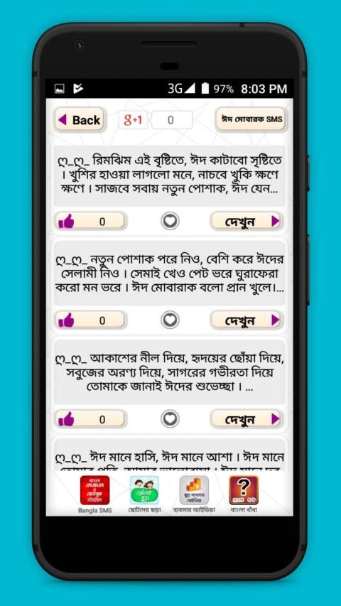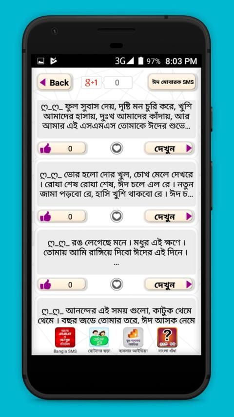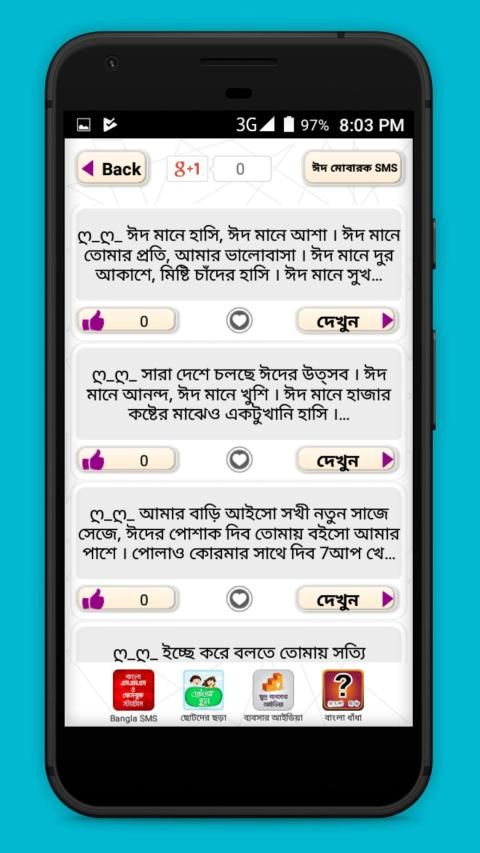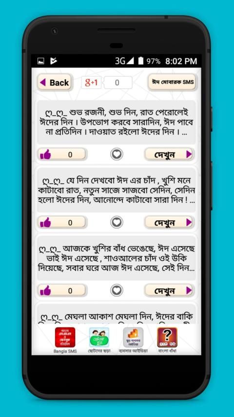 Eid sms Bangla 2020. Eid mubarak SmS 2020 অ্যাপটি হতে পারে bangla sms বাংলা এসএমএস জগতের এক বিশাল ভান্ডার। এখানে আপনি পাবেন অসাধারন সব বাংলা এস এম এস, ভালোবাসার ম্যাসেজ সহ আরও অনেক কিছু। আশা করি আপনার ভালোবাসার মুহূর্ত কে আরও রোমাঞ্চকর করে তুলবে।