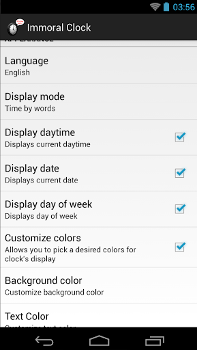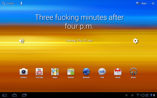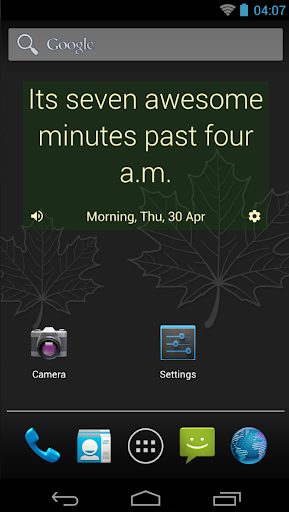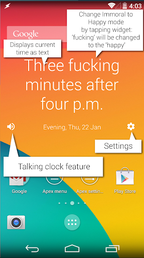 होम स्क्रीन के लिए अनैतिक घड़ियों विजेट (इसे संगत एंड्रॉइड संस्करण 4.2 के साथ फोन पर लॉक स्क्रीन पर भी रखा जा सकता है लेकिन यह 5.0 पर चला गया है)। हमें आशा है कि आपको यह पागल घड़ी पसंद आएगी। उपलब्ध टॉकिंग घड़ी।