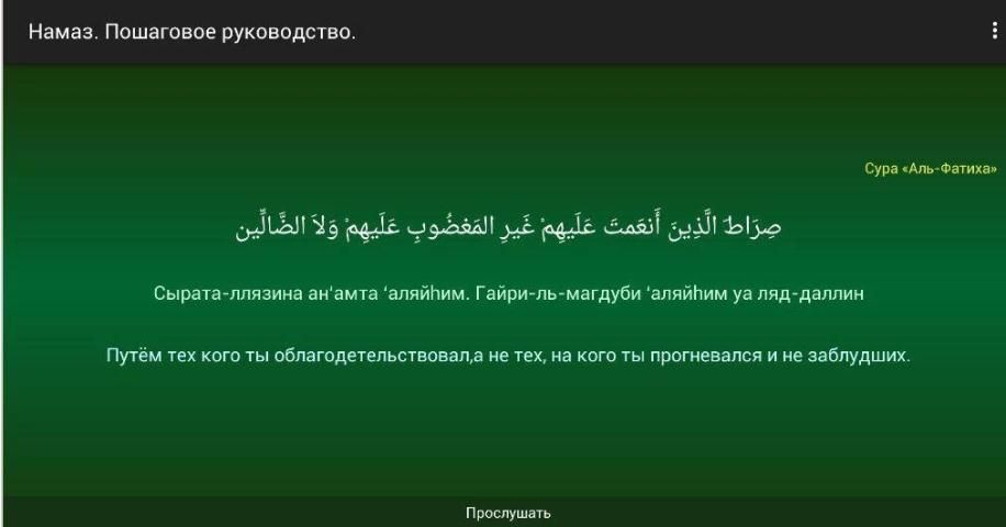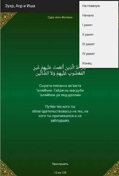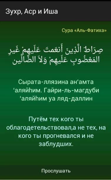 प्रार्थनाओं का हिस्सा सूरा "अल-फ़ातिहा", "अल इखलास" अल-Takasur, अल-मौन, "अल-Kyausar", "अल-अस्र", "अल-Kyafirun", "एक-Nas" प्रस्तुत किया।