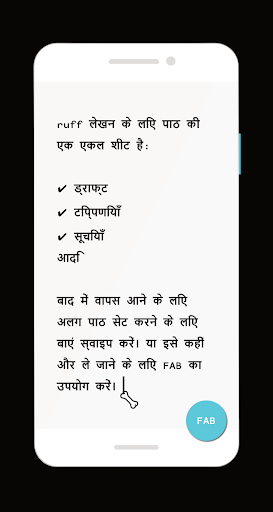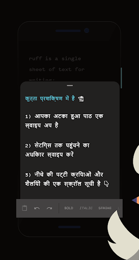 ruff आपकी जेब के आकार का सबसे अच्छा दोस्त है जिसका उद्देश्य गो फन पर लिखना और इसे तेज़ और आसान साझा करना है। यह आपकी प्रगति के साथ पाठ की एक एकल शीट है जो स्वचालित रूप से सहेजा गया है और सत्रों के बीच पुनर्स्थापित किया गया है - यहाँ पर चिंता करने के लिए कोई फ़ाइल प्रबंधन नहीं है! आप बाद में बाईं ओर स्वाइप के माध्यम से वापस आने के लिए एक तरफ (उर्फ स्टैश) टेक्स्ट सेट कर सकते हैं। या आप इसे (उर्फ शेयर) FAB के माध्यम से पास कर सकते हैं।