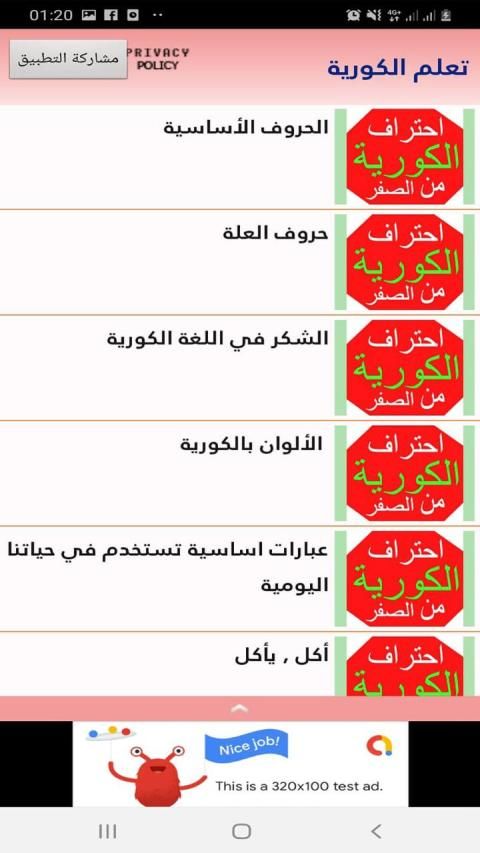 تعلم اللغة الكورية بالعربية برنامج يساعدك في تكلم اللغه الكوريه المشهورة بالإضافة إلى جمل اساسية في الكورية و الأسماء و الألوان و بعض القواعد التي تساعدك ترجمة كورية الى العربية.