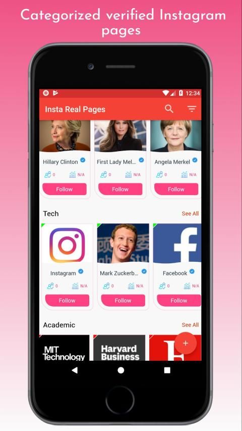 इस ऐप में आप प्रसिद्ध लोगों, संगठनों, संस्थानों और इतने पर संगठित रूप से आधिकारिक और सत्यापित इंस्टाग्राम पेज पा सकते हैं।