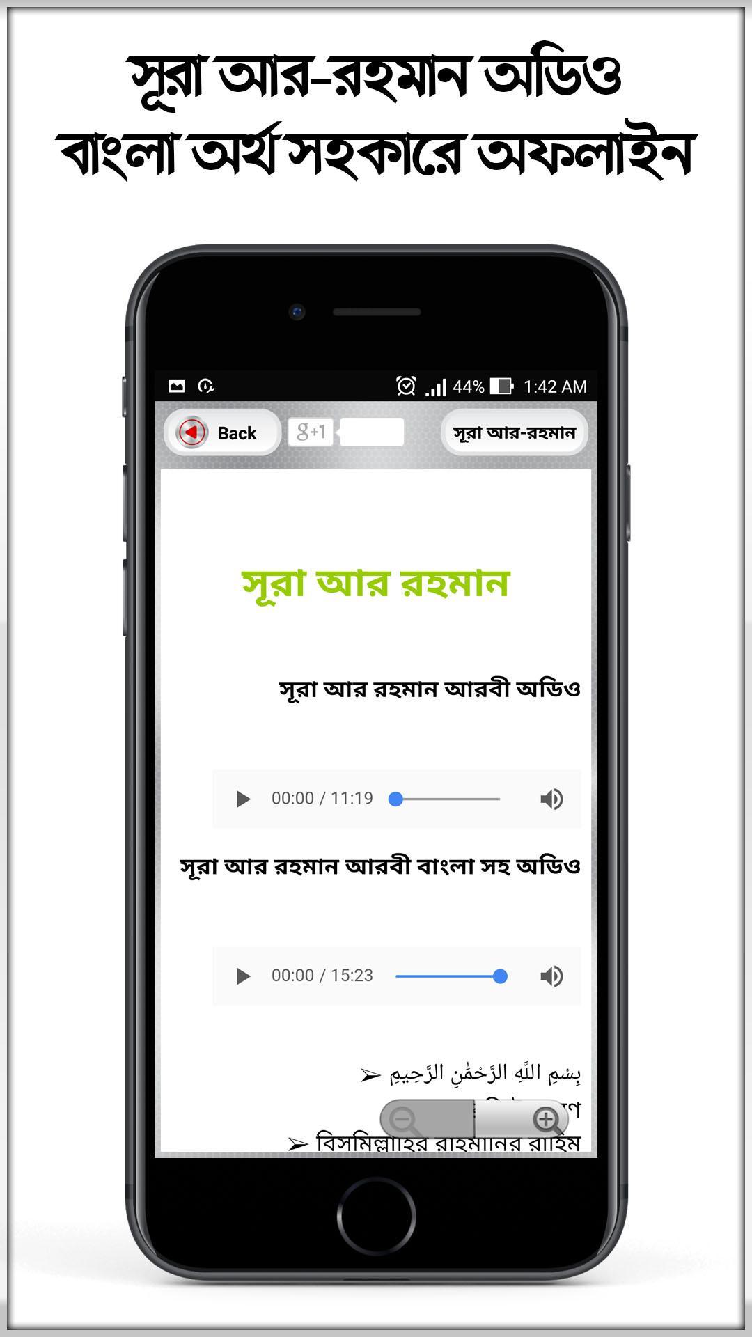 surah rahman learning is very much important for all muslim. surah rahman bangla translation will teach you what is said there. Surah Rahman is so beautiful. surah rahman audio listen in offline without internet connection. Also you will listen surah rahman bangla tarjama. Hope you like surah ar rahman mp3 with bangla application.