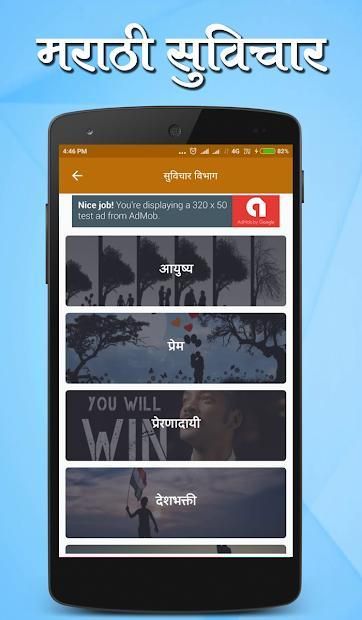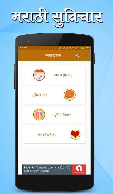 This app contains Thoughts in the Marathi Language collected from various sources, which are further categorized into 13 different categories. This app contains more than 5000+ Marathi Suvichar.