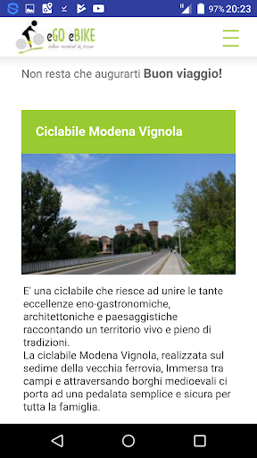 Bike rental & Tour di eGO eBIKE è una App gratuita che ti permette di muoverti in una città non conoscendone le ciclabili e/o le strade a basso traffico che rendono più sicura la tua vacanza in bicicletta. Noleggia una bicicletta o ebike per scoprire le eccellenze della motor valley o le eccellenze enogastronomiche come il l’Aceto balsamico di Modena, Tortellini, Parmigiano reggiano e tanto altro. Il cicloturismo è il modo sostenibile per muoversi, conoscere città in sella ad una bike che sia questa a pedalata assistita o no. Gli itinerari presenti in questa app ti permettono di seguire tour in libertà testati. Inoltre troverai partner sui percorsi dove poter parcheggiare la tua bici, trovare ristoro e riposarti in tranquillità. Musei, Cantine, Caseifici, Oasi Naturalistiche, Acetaie, punti di prelievo biciclette, prenotazione online della bici, casco,accessori e tanto altro è quello che troverai scaricando la App. Le Nostre Bici a Pedalata Assistita hanno