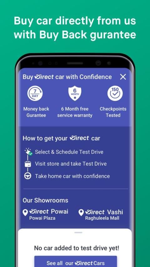 Customers can test drive multiple cars at our Truebil Direct showrooms. Truebil ensures that the transfer of the used car documents and ownership is smooth and timely. Truebil has tied up with various finance companies to ensure easy financing of pre-owned cars in the form of affordable monthly EMIs. It also provides comprehensive and zero depreciation car insurance on used cars (second hand cars) in Mumbai, Bangalore, and Delhi.