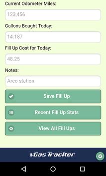 Use the vGas Smart Tracker to log your fill ups at the gas station. The app will then calculate your latest Miles Per Gallon fuel efficiency and your car's life total. The vGas Smart Tracker can help you become a better driver.
