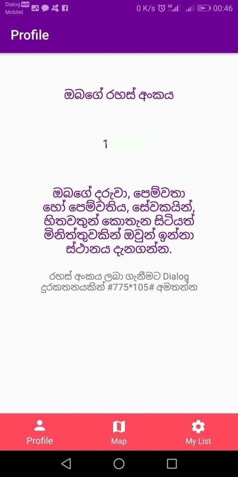 आपका नंबर और वह व्यक्ति जिसे आप खोजते हैं, दोनों को किसी भी Dilaog मोबाइल का उपयोग करके Ideamart vLocate सेवा के साथ पंजीकृत होना चाहिए। स्मार्ट फोन की जरूरत नहीं।
