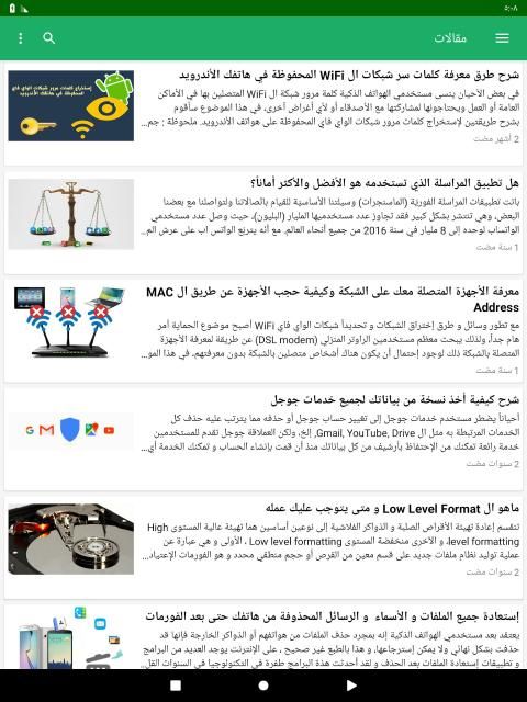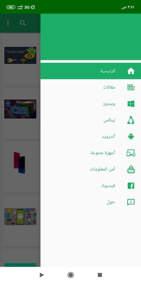 يوجد أيضاً فى التطبيق قائمة جانبية تحتوي على جميع أقسام المدونة و هي مقالات، ويندوز، لينكس، أندرويد، أجهزة متنوعة، أمن المعلومات، فيسبوك.