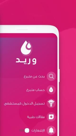 وريد :- هو تطبيق إلكتروني مجاني، هدفه إيجاد قاعدة بيانات المتبرعين بالدم ، لتسهيل عملية الوصول إلى المتبرعين بالدم للأشخاص والمستشفيات حسب الفصيلة والمنطقة ، ويعمل التطبيق كهمزة وصل بين المتبرع والمتبرع له ،عن طريق توفير البيانات التي تساعدك للتواصل مباشرة مع المتبرع كرقم الهاتف، او التواصل مع المركز الصحي الذي سيوفر لك الفصيلة التي تحتاجها.