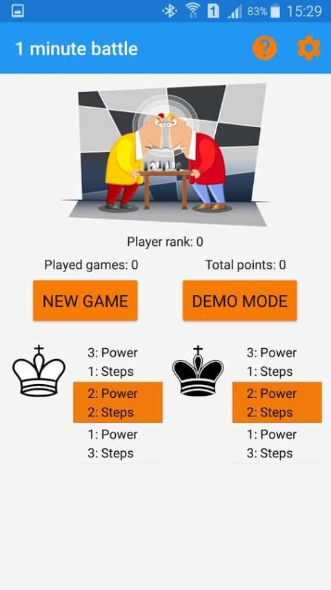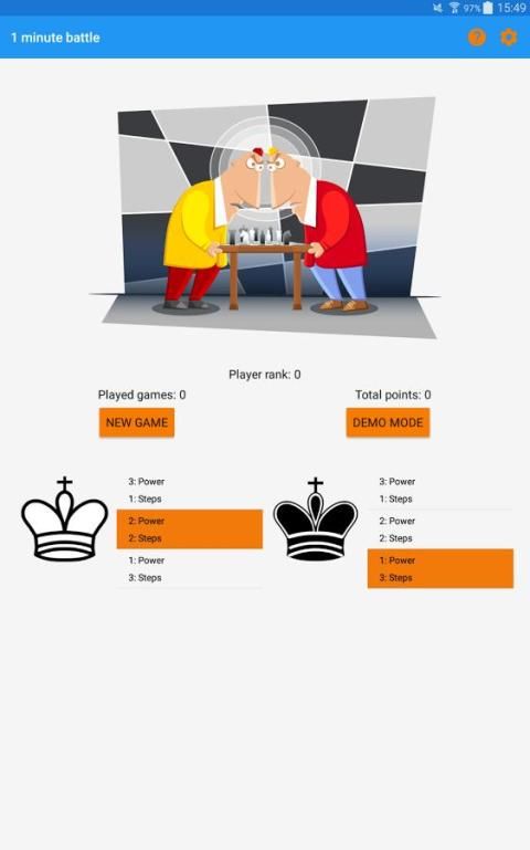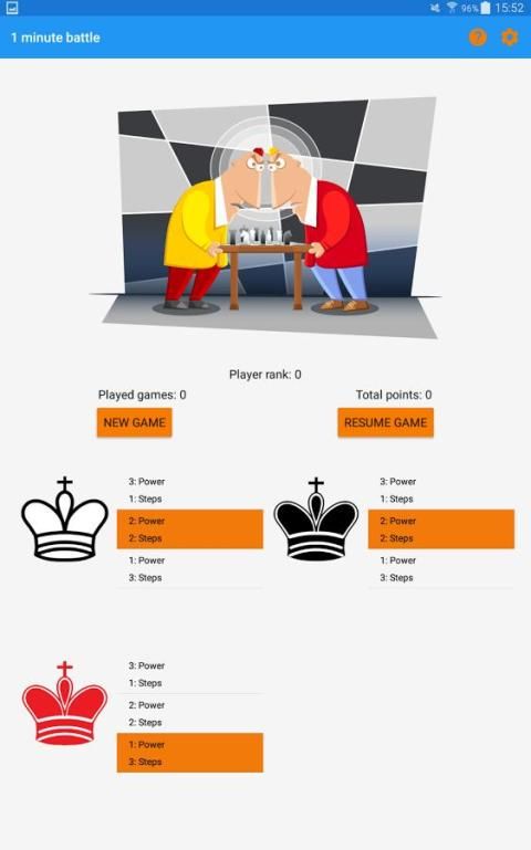 एक मिनट लड़ाई मोबाइल उपकरणों और कंप्यूटर के लिए विकसित एक मजेदार तालिका खेल है। यह खिलाड़ियों की तार्किक सोच और रणनीतिक योजना कौशल में सुधार। यह बिल्कुल शतरंज नहीं है और विशेष ज्ञान या कौशल की आवश्यकता नहीं है। ऐसा इसलिए है क्योंकि यह उनकी सोच और गिनती कौशल में सुधार होगा उपयुक्त खेल भी बच्चों के लिए बनाता है। वे ऊब क्योंकि हर खेल वास्तव में 1-2 मिनट में समाप्त कर सकते हैं नहीं मिलेगा।
