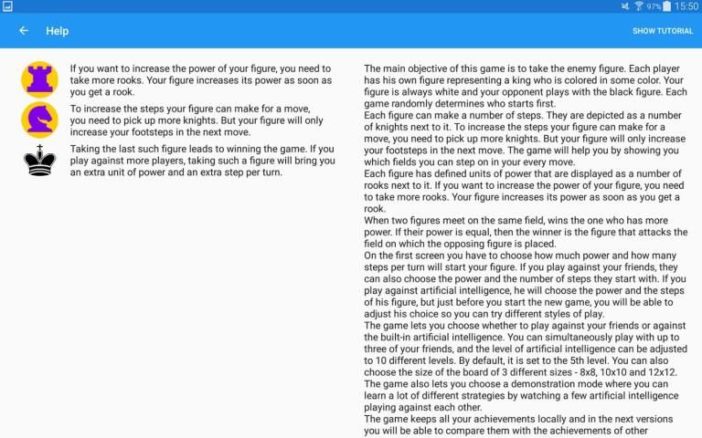 उपयोगकर्ता एक प्रतिद्वंद्वी नहीं मिल सकता है, तो एक खिलाड़ी उसके खिलाफ खेलने के लिए विकसित की जटिलता के 10 के स्तर के साथ एक कृत्रिम खुफिया द्वारा नियंत्रित है। उपयोगकर्ता भी एक डेमो मोड जहां खिलाड़ियों के इस प्रकार के कई एक दूसरे के खिलाफ खेलते हैं डाल सकते हैं। इस विस्तार से खेल के नियमों से परिचित हो और विभिन्न खेल रणनीति खोजने के लिए मदद मिलेगी।