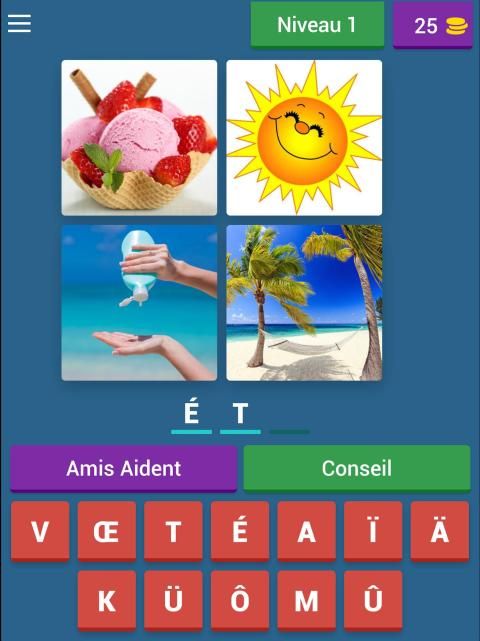 Comment jouer ? Regardez 4 images et devinez le mot qui les relie. Pour chaque mot que vous devinez, vous gagnez des pièces qui vous aideront à atteindre de nouveaux niveaux. Et en plus c'est gratuit.