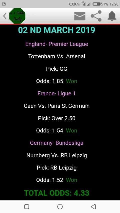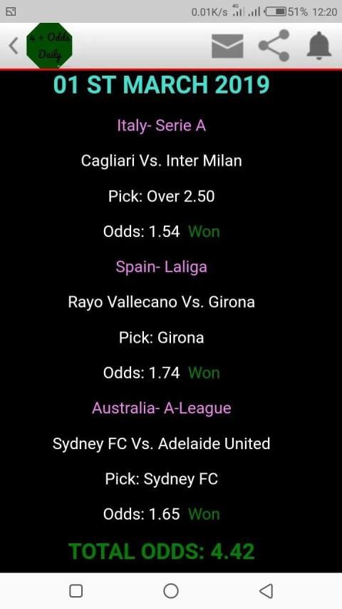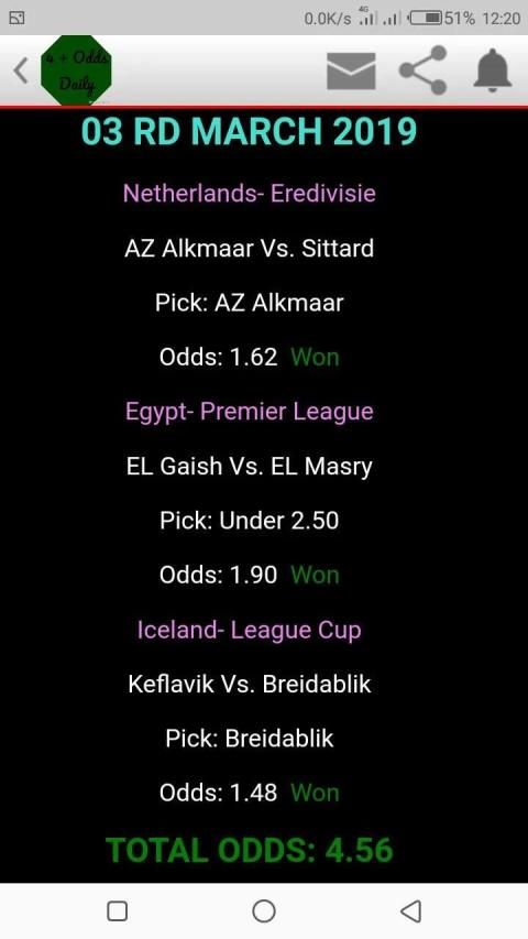 This Application is developed to provide you with the most refined and well-analysed games. It provides you with 4+ odds for HTFT matches, UNDER and OVER 2.50 and correct score. This is the home of winners