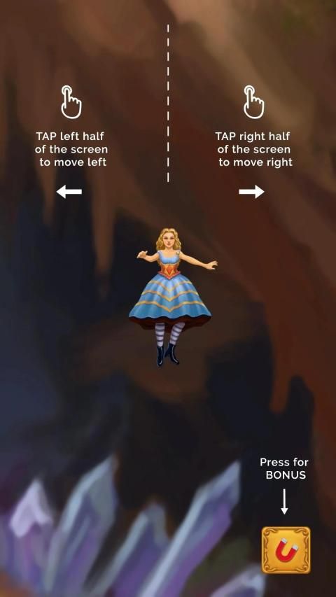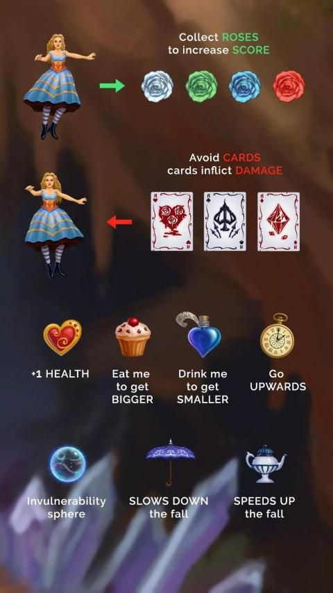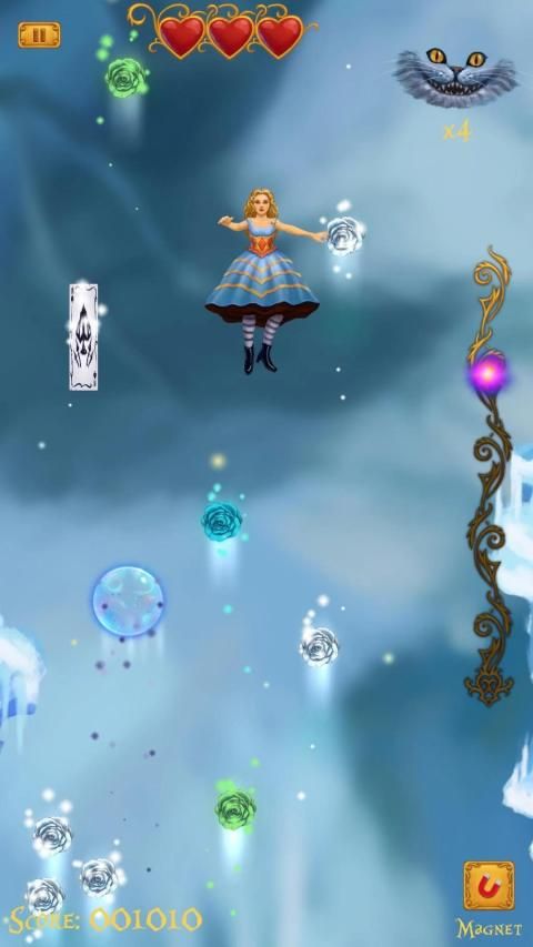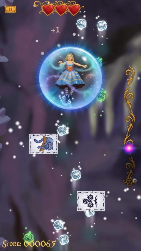 A funny game in which you have to work hard to help Alice! There are many obstacles and dangers on the way of the beautiful girl to the magic kingdom. If you are ready to challenge them, do not hesitate, go ahead! The main thing is do not stop, keep moving, collect jewels and avoid cards preventing Alice from returning home.