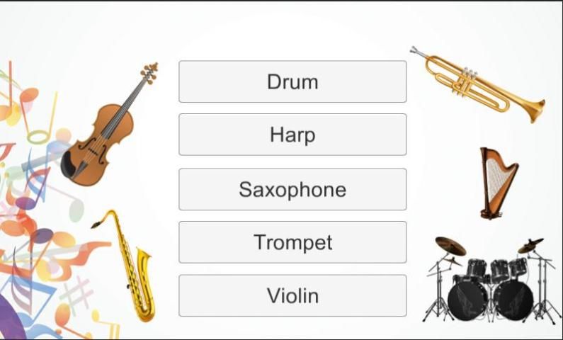 तुरही, ड्रम, सैक्सोफोन, वीणा, वायलिन