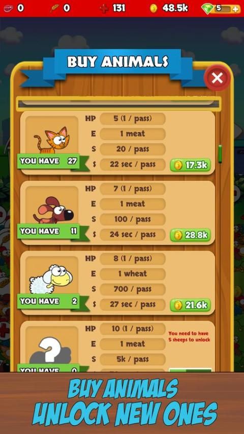 तुम बिल्लियों, कुत्तों, मुर्गी, गदहे, घोड़े, छिपकली, भेड़, शेर और कई अलग अलग पालतू जानवर खरीद सकते हैं। तुम भी उन्हें दुर्लभ जानवरों में उन्नयन कर सकते हैं।