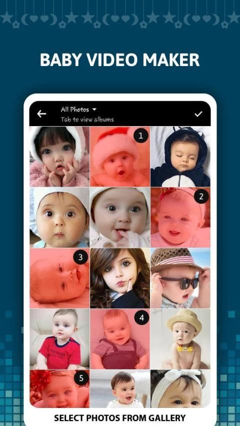 अपने शिशु वीडियो निर्माता बनाने के लिए कई चरण जैसे - फ़ोटो का चयन करना, ट्रांज़िशन एनीमेशन लागू करना, फ़ोटो, टेक्स्ट और संगीत के लिए फ़िल्टर जोड़ना, बेबी स्लाइड फ़्रेम जोड़ना और बेबी वीडियो बनाने के लिए फिनिश पर क्लिक करना।