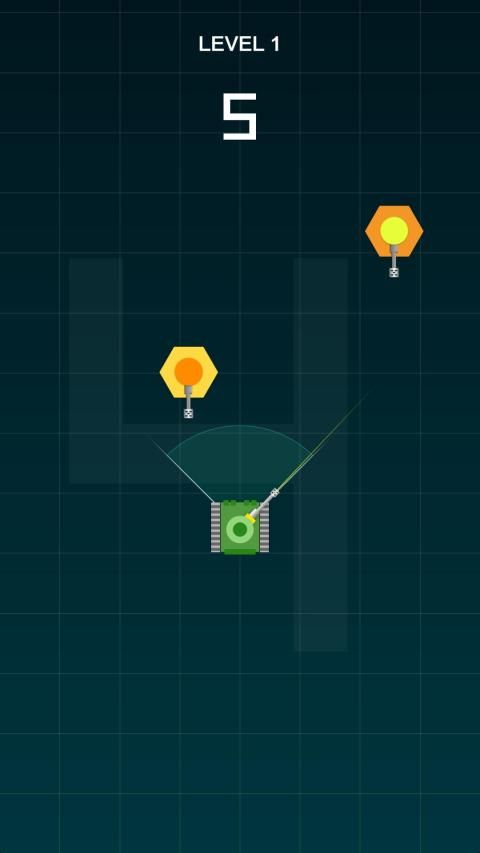 One tap to fire, destroy the hexagon enemy, got points! Each level have 4 sections, one bullet to kill one enemy. Tank Barrel is swinging left and right, take the opportunity, aim at the enemy, fire! destroy it!
