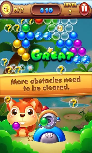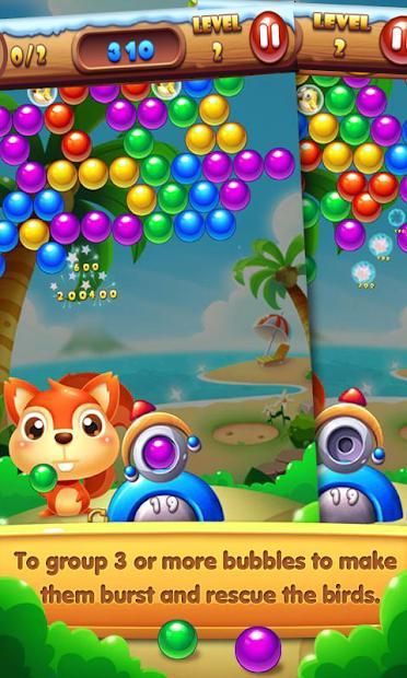 ★ To group 3 or more bubbles to make them burst and rescue the birds.