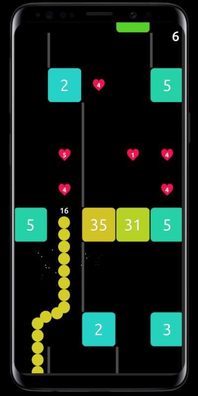 Swipe your finger to move on screen, let snake of balls slide and break Block. Be careful about the strength of blocks, harvest hearts and balls to feed your snake.