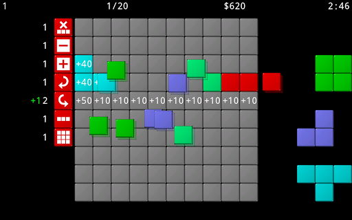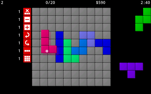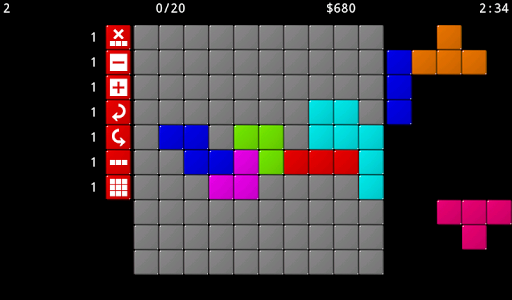 Fill the game field by pieces consisting of square blocks to set a filled horizontal or vertical line which will removed. You have to fill at least twenty lines by three minutes.