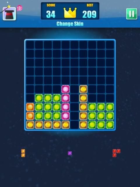 1010 आकार बोर्ड के साथ। पंक्तियों और colums स्क्रीन पर ब्लॉक से भरा बनाएं। अलग अलग आकार के ब्लॉक जगह और ब्लॉक के साथ पंक्तियों में भरें। स्क्रीन के नीचे आप आकृतियों है कि अगली बारी दिखाई देगा।