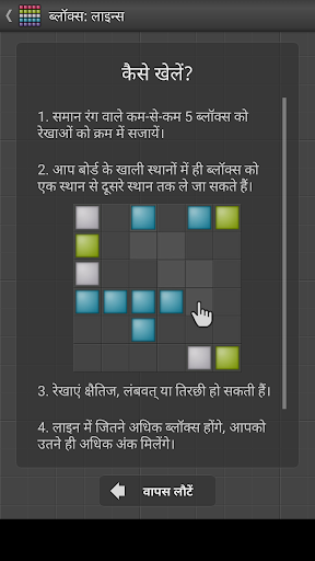 - समान रंग वाले कम से कम 5 ब्लॉक्स वाली रेखाओं को क्रम में सजाएं। लाइन में जितने अधिक ब्लॉक होंगे, आपको उतना ही अधिक अंक मिलेगा।