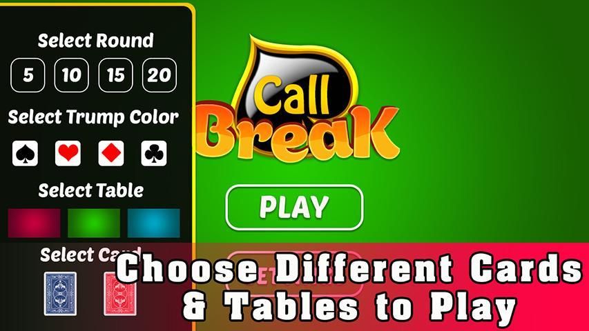 कॉल ब्रेक, ट्रम्प कार्ड के रूप में कुदाल के साथ एक चार खिलाड़ी कार्ड गेम है और 52 कार्डों के एकल डेक के साथ खेला जाता है। प्रत्येक खिलाड़ी को 13 कार्ड मिलते हैं और खेल की शुरुआत प्रत्येक खिलाड़ी को अपने संभावित हाथों से बुलाकर की जाती है। प्लेयर फिर पूर्वनिर्धारित नियमों के साथ खेलता है और सुनिश्चित करता है कि वे अपने हाथों से अधिक जीतें। गेम में कुल 5 राउंड हैं और 5 राउंड के अंत में अधिकतम स्कोर वाला खिलाड़ी विजेता है।