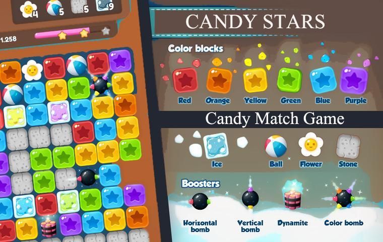 The basic gameplay elements found in candy puzzle match stars game.