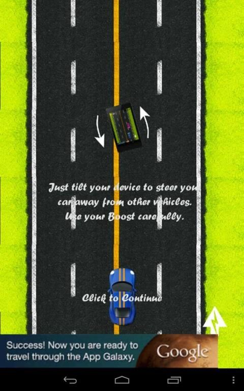 The aim of the player is to tilt his device to steer away from the incoming vehicles. The game also includes checkpoints which the player can catch for extra points and a handy boost function for those players that are hard to trill.