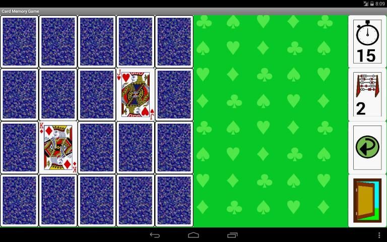 Card Memory Game is a card game in which cards are laid face down on a table and two cards are flipped face up on each turn. The object of the game is to turn over pairs of matching cards. The game is also known as Memory or Pairs. In our version of the game player can use decks of 20 or 32 playing cards. Cards are laid face down in four rows of five or eight cards each. In each turn player chooses two cards and turns them face up. If they are of the same rank and color (ace of hearts and ace of diamonds, king of clubs and king of spades, …) player wins the pair and cards are removed from the table. The game ends when the last pair is picked up. Time is recorded and added to leaderboard.