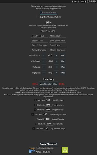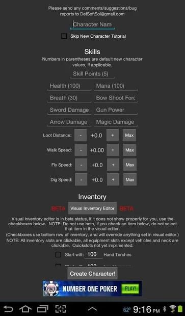 Simply enter a character name, then fill in your desired starting skills (leave blank for in game defaults), select starting items,and click create.It's that simple!