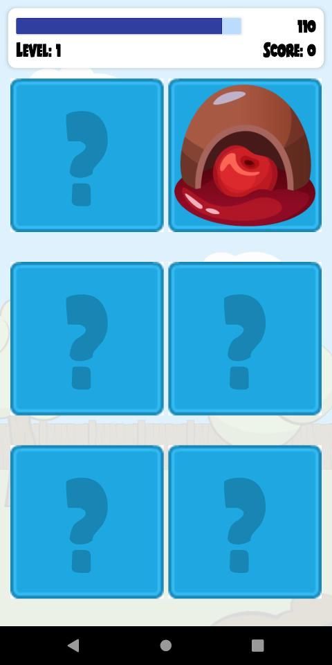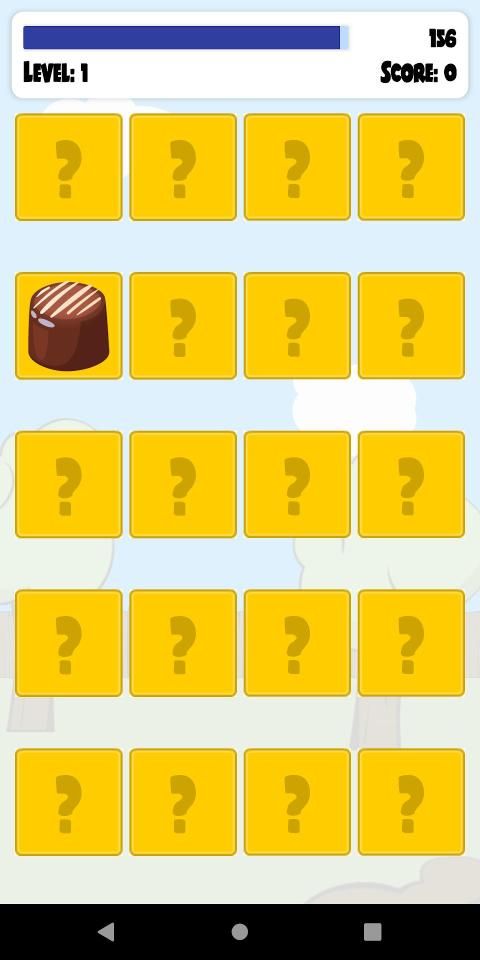 For each level, player is required to tap the square buttons and need to memorize what is behind it in order to match its couple. Players are required to complete a level in minimum finger taps to match all Chocolates.