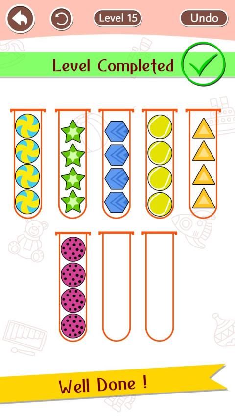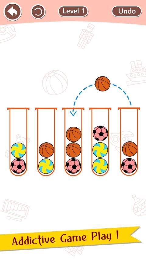 In this puzzle game, there will be some test tubes containing colorful designed balls. All different color balls will be jumbled up inside the test tubes and you have to sort the balls based on its color.