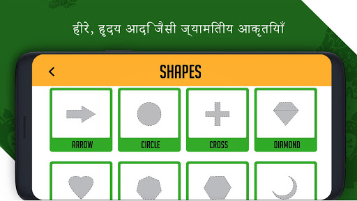 डायमंड, हार्ट, हेक्सागोन, मून, एरो, क्रॉस, ओवल या अन्य बुनियादी आकार जैसे सर्कल, आयत और त्रिकोण जैसे ज्यामितीय आकृतियाँ।