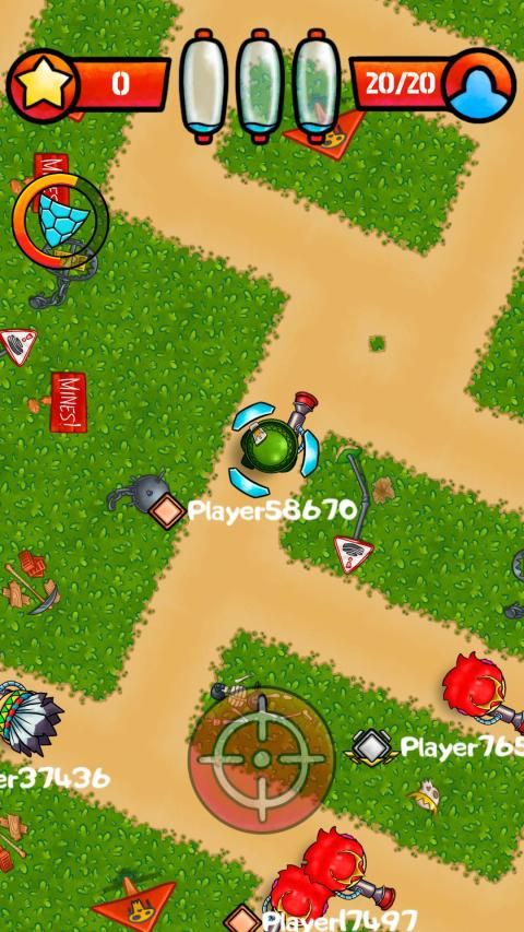 Battlefields designed for 20 players, where every man for himself. Whole map is mined. Stepping on mine means loss, so players must stick to safe roads and think over the routes beforehand for tactical advantage. As you play safe zone will become smaller because of death field around the map.